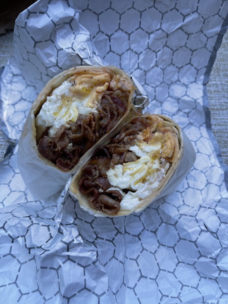 3 eggs over easy, grilled onions, home fries and BBQ sauce on a wrap.
