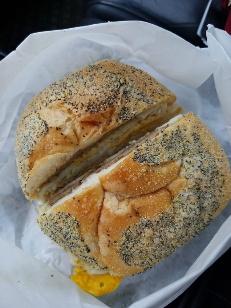 2 eggs, bacon, sausage, onions, cheese on a roll.