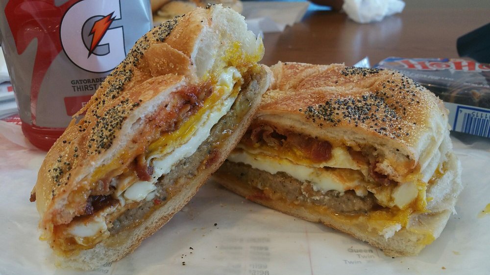 3 eggs, bacon, sausage, ham, potatoes, cheese, onions on a hero.